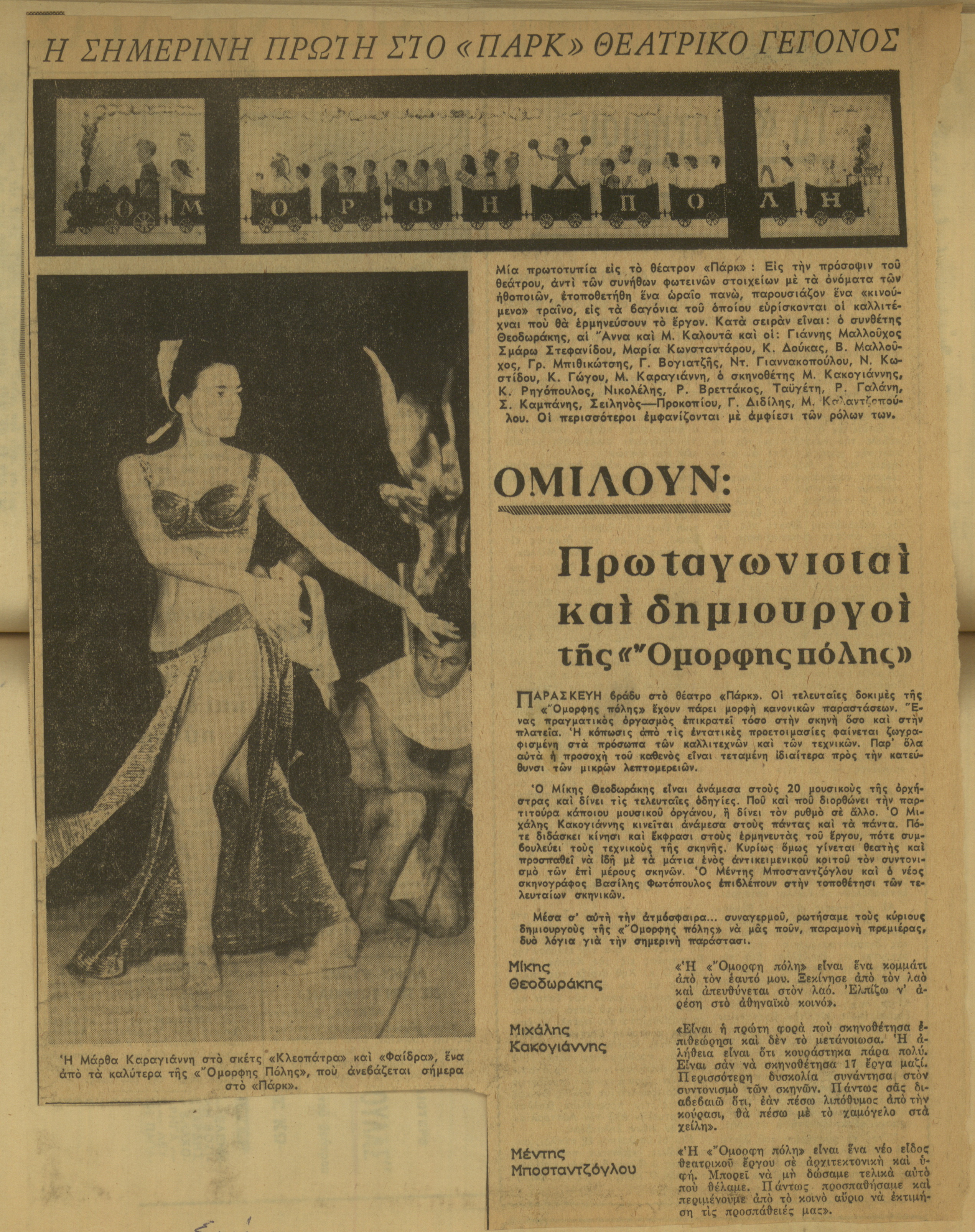Η σημερινή πρώτη στο "Πάρκ" θεατρικό γεγονός. Ομιλούν: Πρωταγωνισταί και δημιουργοί της "Όμορφης Πόλης" 29.04.2014